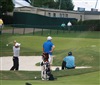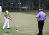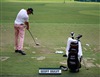 Titleist Tour Rep Jim Curran looks on as Titleist Brand Ambassador Gary Woodland sends his Pro V1 golf ball sailing.