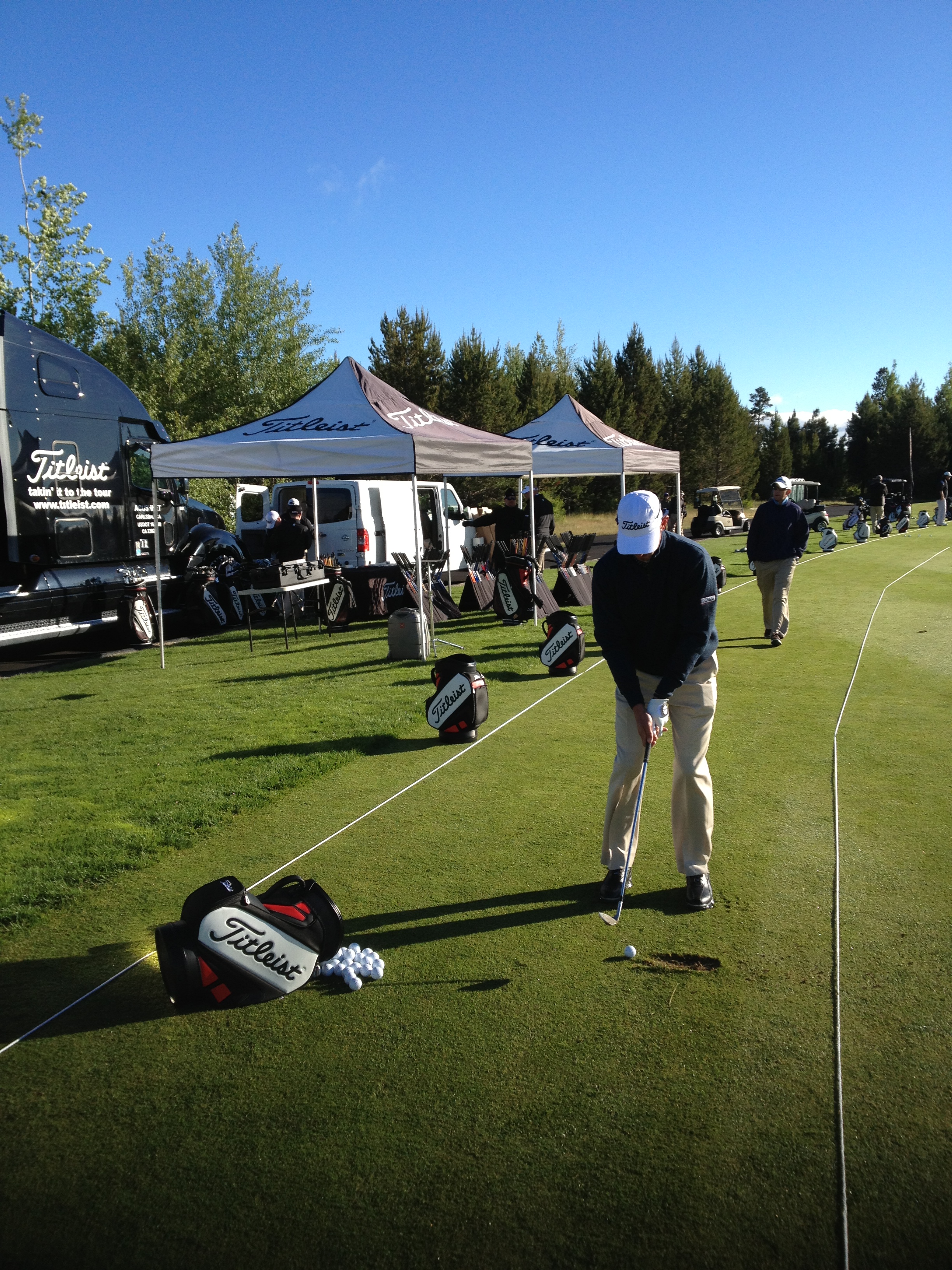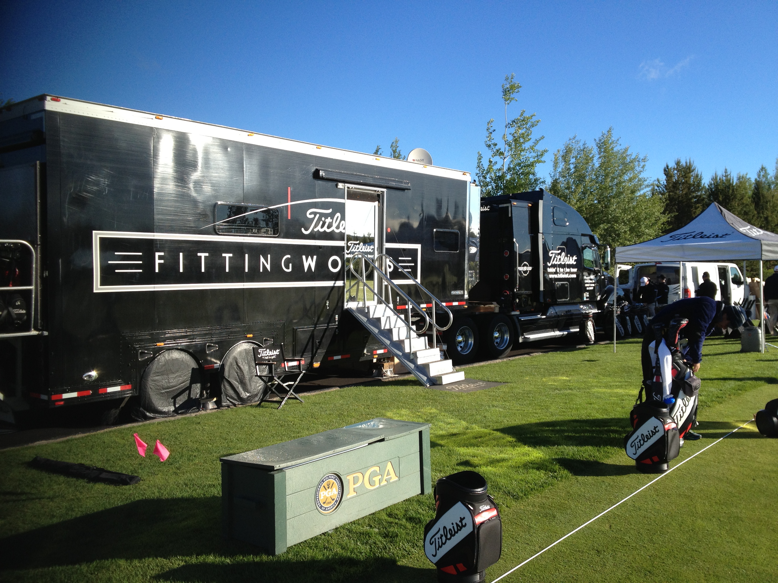 Our Oceanside fitters have flown up and our 40' FittingWorks Tour Van has crossed the Rocky Mountains to work with our Titleist PGA staff pros that have qualified for the 46th PGA PNC at Sunriver, Oregon. It will be held on June 23rd through the 26th at Crosswater Club and the Meadows Golf Course. This tournament is a chance for our PGA club pros to compete against the rest of their peers with the top 20 finishers earning a berth at the PGA Championhip. The Team is setting up on the range and I have