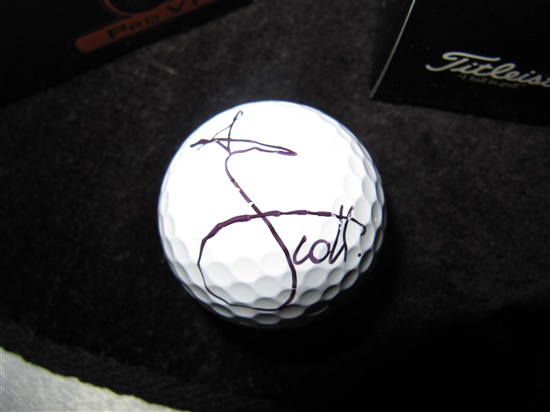 I wanted to take this opportunity to thank Team Titleist for the awesome prize I won a few weeks ago. I won a signed Adam Scott golf ball, TT towel, TT shirt and a sleeve of Pro V1's. Wow. Love it!